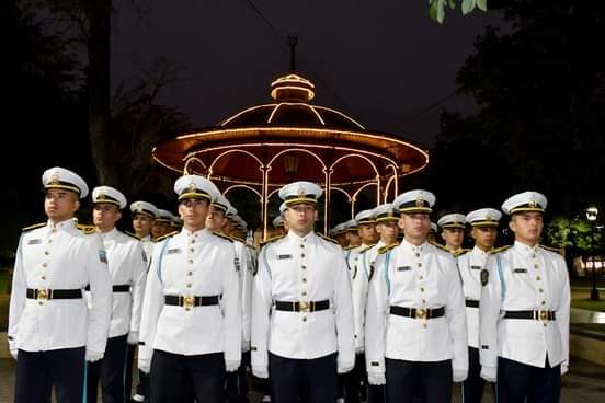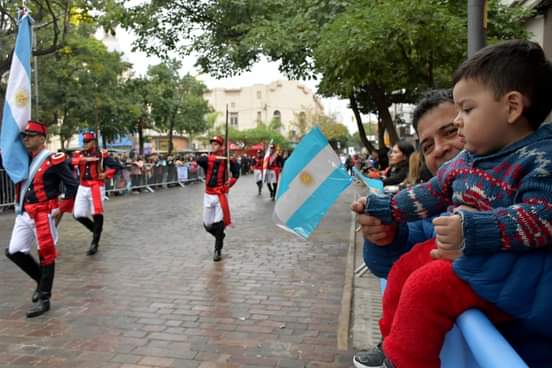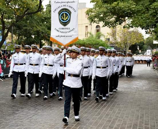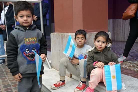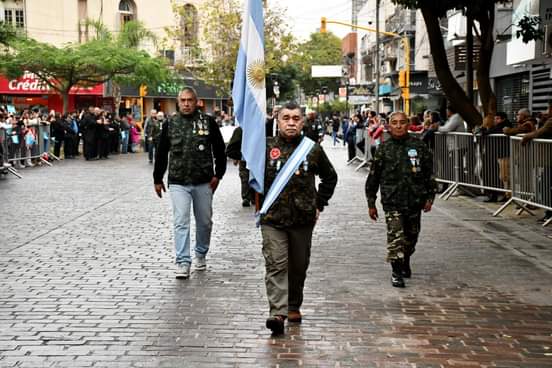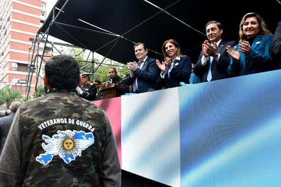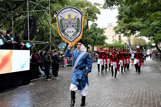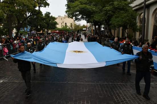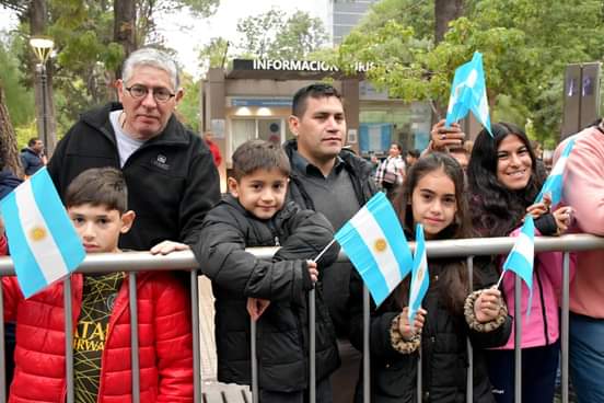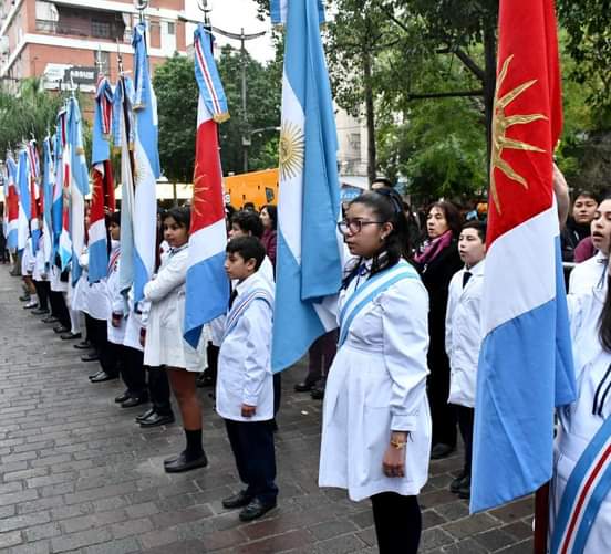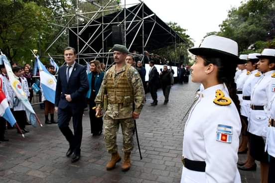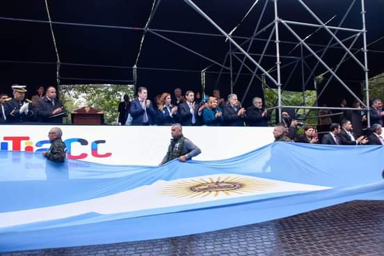 Luego del tradicional chocolate caliente, las autoridades presidieron el acto central con el desfile de instituciones educativas, fuerzas de seguridad y ex combatientes de Malvinas