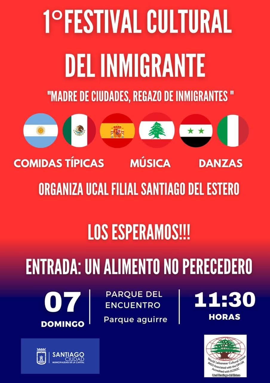 Con el auspicio de la Municipalidad de la Capital, el domingo 7 de septiembre en el Parque del Encuentro, desde las 11.30 hasta las 19 horas, se realizará el primer festival cultural Madre de Ciudades, regazo de Inmigrantes”; para homenajear a quienes vinieron a asentarse y construir su destino en Santiago del Estero.